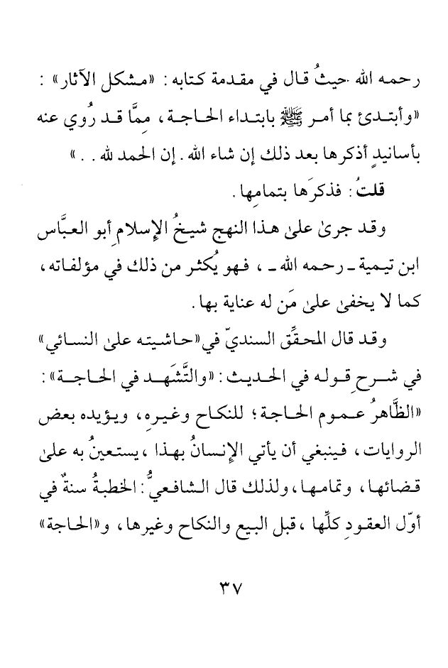 رحمه الله حيث قال في مقدمة كتابه "مشكل الآثار": وأبتدئ بما أمر صلى الله عليه وسلم بابتداء الحاجة مما قد روي عنه بأسانيد أذكرها بعد ذلك إن شاء الله: إن الحمد لله ... "