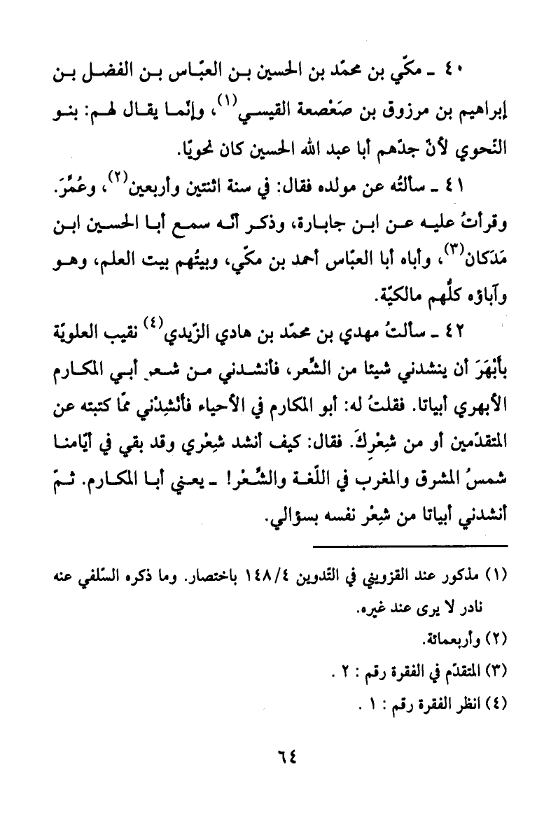 42- سألت مهدي بن محمد بن هادي الزيدي نقيب العلوية بأبهر أن ينشدني شيئاً من الشعر، فأنشدني من شعر أبي المكارم الأبهري أبياتاً. فقلت له: أبو المكارم في الأحياء فأنشدني مما كتبته عن المتقدمين أو من شعرك. فقال: كيف أنشد شعري وقد بقي في أيامنا شمس المشرق والمغرب في اللغة والشعر! - يعني أبا المكارم. ثم أنشدي أبياتاً من شعر نفسه بسؤالي.