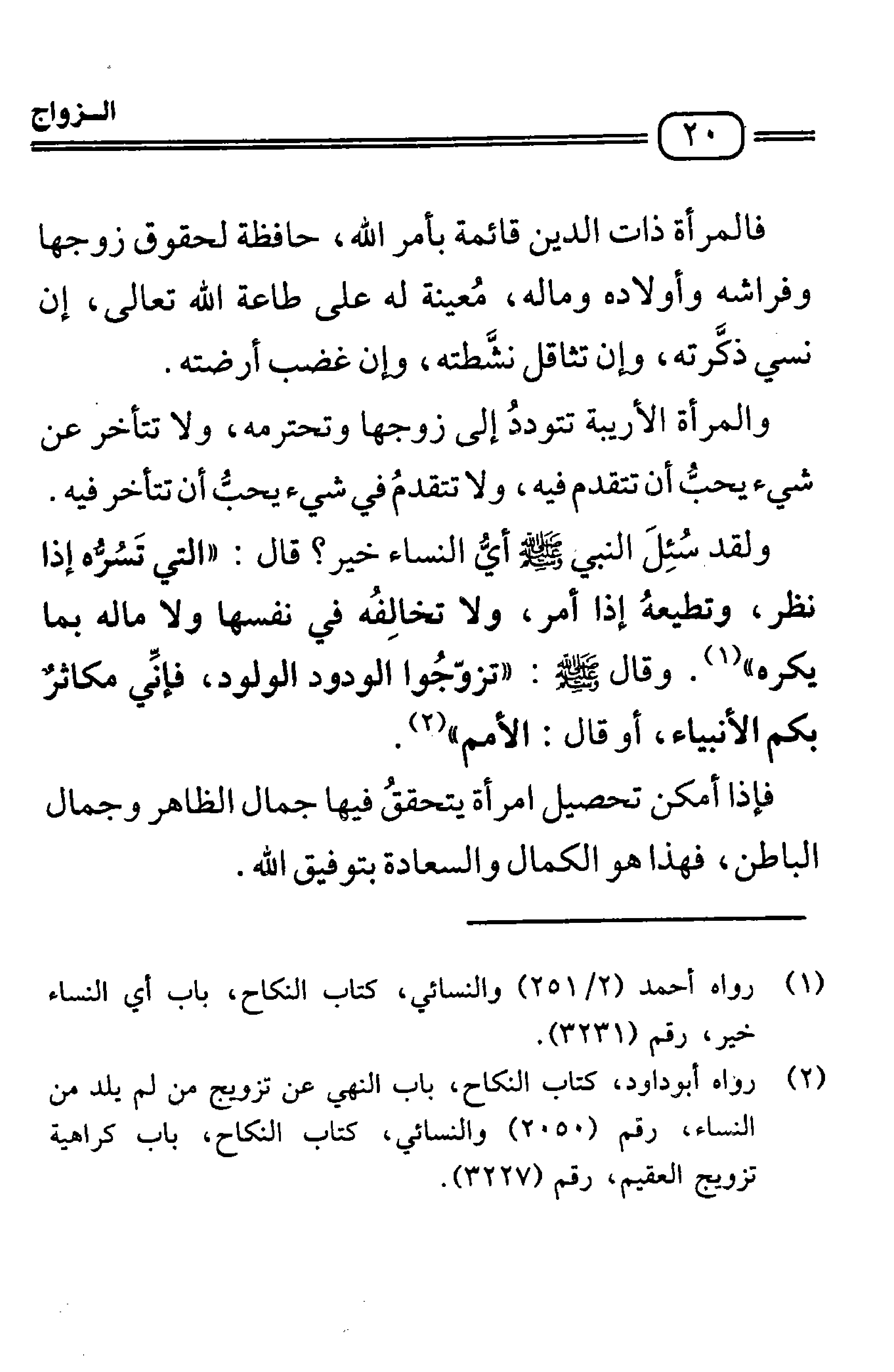 والمرأة الأدبية تتودد إلي زوجها وتحترمه ولا تتأخر عن شئ يحب أن تتقدم فيه ولا تتقدم في شئ يحب أن تتأخر فيه ولقد سئل النبي صلي الله عليه وسلم أي النساء خير؟ قال: "التي تسره إذا نظر وتطيعه إذا أمر ولا تخالفه في نفسها ولا ماله بما يكره" 1 وقال صلي الله عليه وسلم: "تزوجوا الودود الولود فاني مكاثر بكم الأنبياء، أو قال: الأمم" 2.