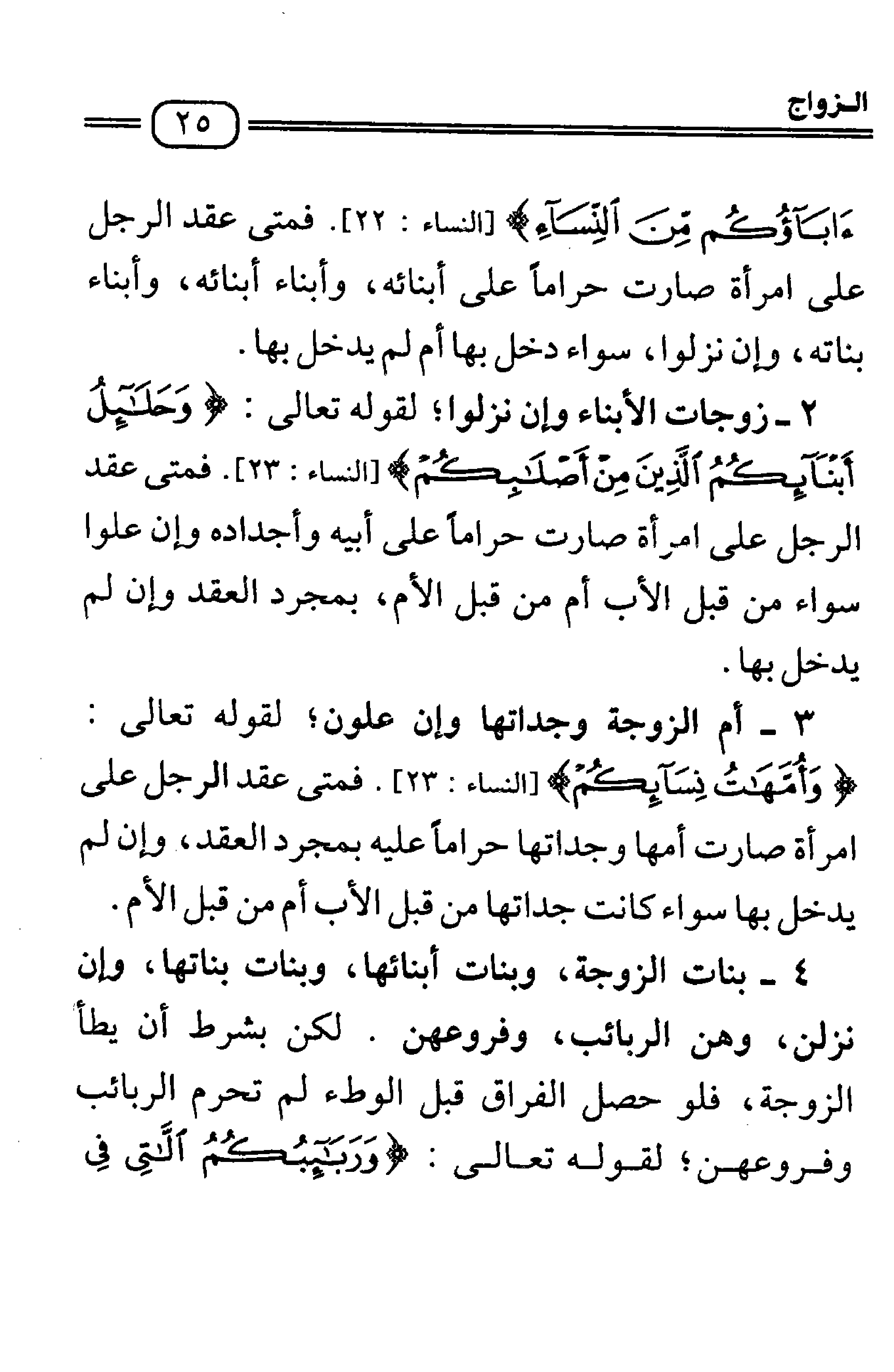 1- زوجات الأبناء وان نزلوا،لقوله تعالى: {وَحَلائِلُ أَبْنَائِكُمُ الَّذِينَ مِنْ أَصْلابِكُمْ} [النساء-23] فمتى عقد الرجل على امرأة صارت حراما على أبيه وأجداده وإن علوا سواء من قبل الأب أم من قبل الأم بمجرد العقد عليها وإن لم يدخل بها.