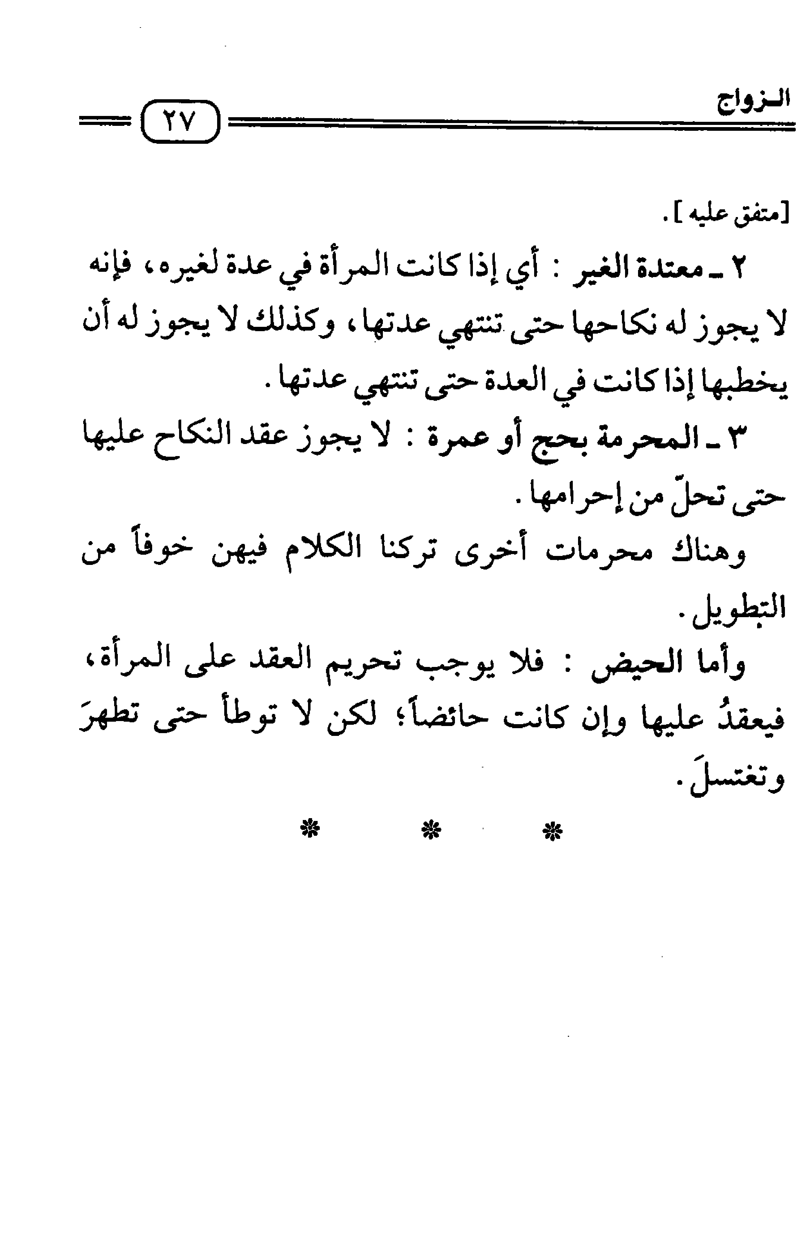 3- المحرمة بحج أو عمرة: لا يجوز عقد النكاح عليها حتى تحل من إحرامها. وهناك محرمات أخرى تركنا الكلام فيهن خوفا من التطويل.