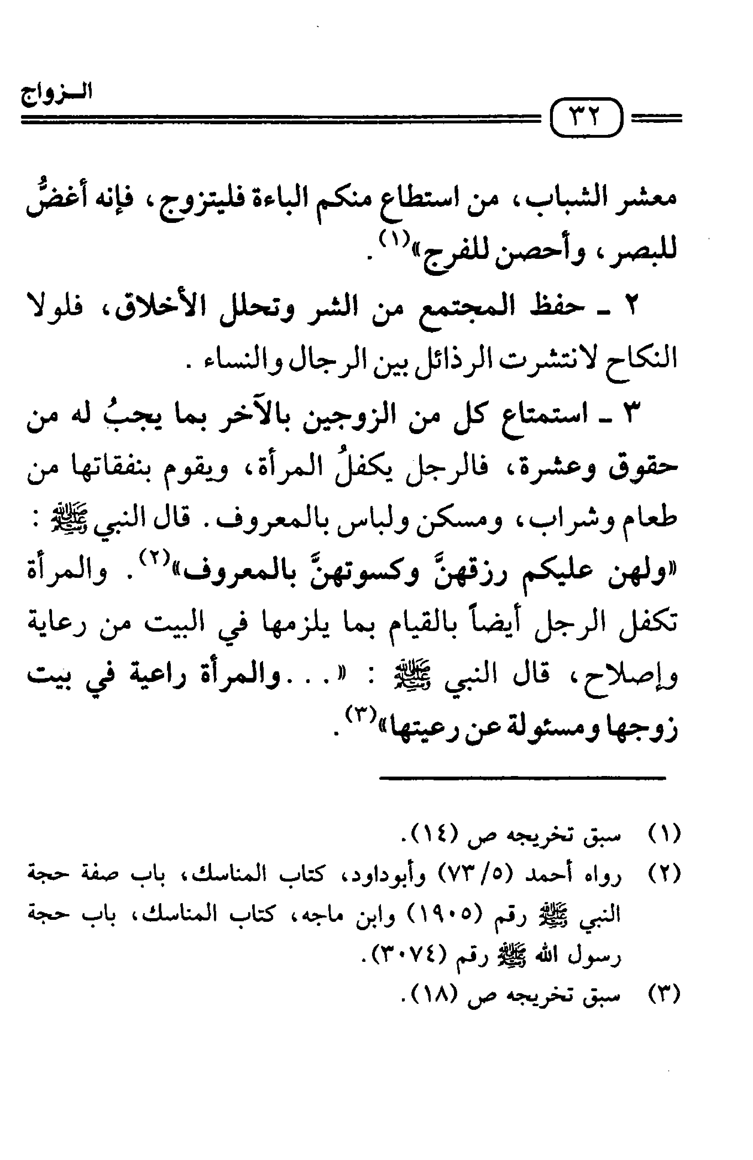 3- استمتاع كل من الزوجين بالآخر بما يجب له من حقوق وعشرة فالرجل يكفل المرأة ويقوم بنفقاتها من طعام وشراب ومسكن ولباس بالمعروف قال النبي صلي الله عليه وسلم: "ولهن عليكم رزقهن وكسوتهن بالمعروف" 2. والمرأة تكفل الرجل أيضا بالقيام بما يلزمها في البيت من رعاية وإصلاح قال النبي صلي الله عليه وسلم: " ... والمرأة راعية في بيت زوجها ومسئولة عن رعيتها" 3.