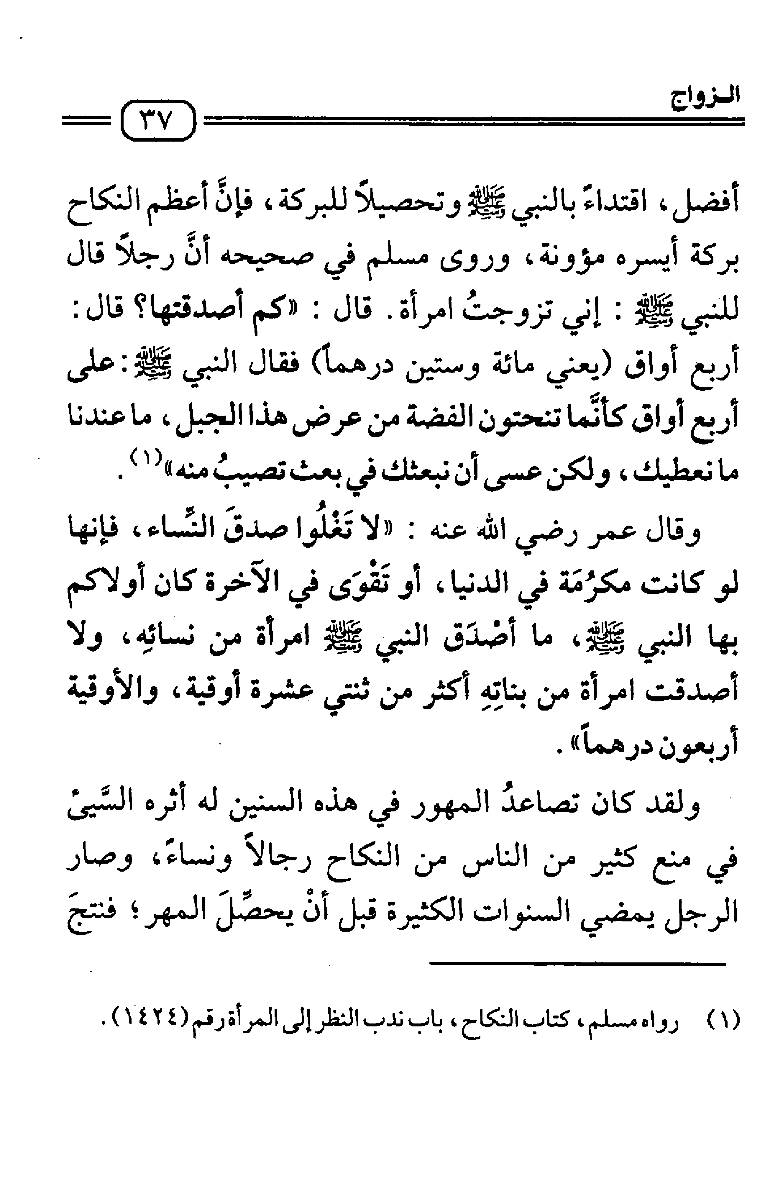 أفضل إقتداء بالنبي صلي الله عليه وسلم وتحصيلا للبركة فان أعظم النكاح بركة أيسره مؤونة وروى مسلم في صحيحه أن رجلا قال للنبي صلي الله عليه وسلم: أني تزوجت امرأة. قال: "كم أصدقتها؟ " قال: أربع أواق يعني مائة وستين درهما فقال النبي صلي الله عليه وسلم: "على أربع أواق كأنما تنحتون الفضة من عرض هذا الجبل، ما عندنا ما نعطيك ولكن عسى أن نبعثك في بعث تصيب منه" 1.