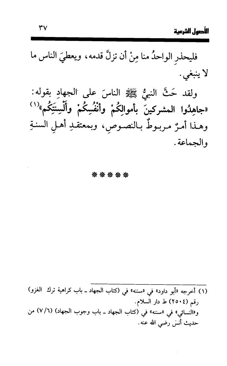 ولقد حث النبي قيل الناس على الجهاد بقوله: «جاهدوا المشركين بأموالكم وأنفسكم وألسنتكم» (¬1) وهذا أمر مربوط بالنصوص، وبمعتقد أهل السنة والجماعة.