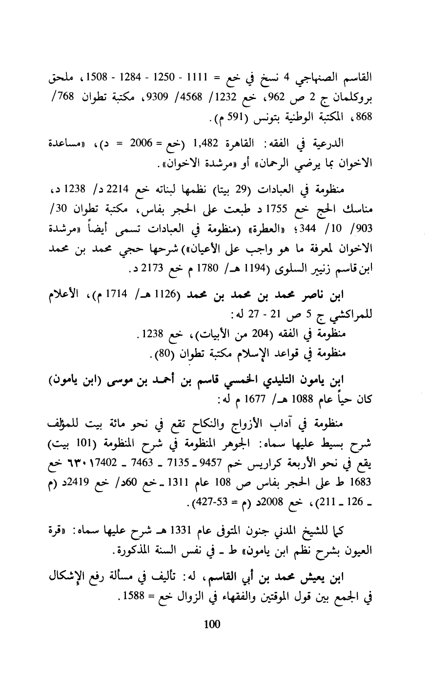 القاسم الصنهاجي 4 نسخ في خع = 1111 - 1250 - 1284 - 1508، ملحق بروكلمان ج 2 ص 962، خع 1232/ 4568/ 9309، مكتبة تطوان 768/ 868، المكتبة الوطنية بتونس (591 م).