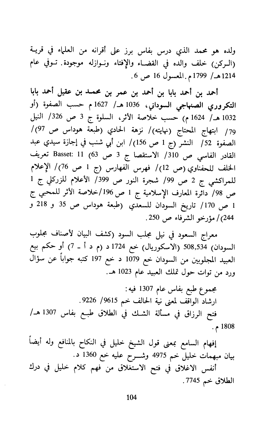 معراج السعود في نيل مجلب السود (كشف البيان لأصناف مجلوب السودان) 508,534 (الاسكوريال) خع 1724 د (م د أ- 7) أو حكم بيع العبيد المجلوبين من السودان خع 1079) & 197 كتبه جواباً عن سؤال ورد من توات حول تملك العبيد عام 1023 هـ.