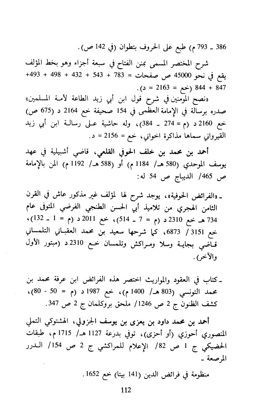 -"الفرائض الحوفية"، يوجد شرح لها لمؤلف غير مذكور عاش في القرن الثامن الهجري من تلاميذ أبي الحسن الطنجي الفرضي المتوفى عام 734 هـ خع 2310 د (م = 7 - 514)، خع 2011 د (م = 1 - 132) , خع 3151/ 6873,كما شرحها سعيد بن محمد العقباني التلمساني قاضي بجاية وسلا ومراكش وتلمسان خع 2310 د (مبتور الأول والآخر).