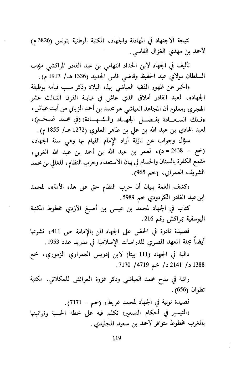 دالية في الجهاد (111 بيتا) لابن إدريس العمراوي الزموري، خع 1388 د/ 2141 د/ خم 4719/ 7170.