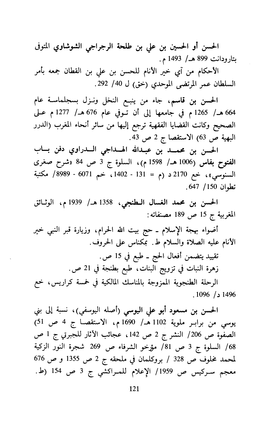 الحسن بن محمد بن عبد الله الهداجي الدراوي دفن باب الفتوح بفاس (1006 هـ/ 1598 م)، السلوة ج 3 ص 84 "شرح صغرى السنوسي"، خع 2170 د (م = 131 - 1402, خم 6071 - 8989/ مكتبة تطوان 150/ 647.
