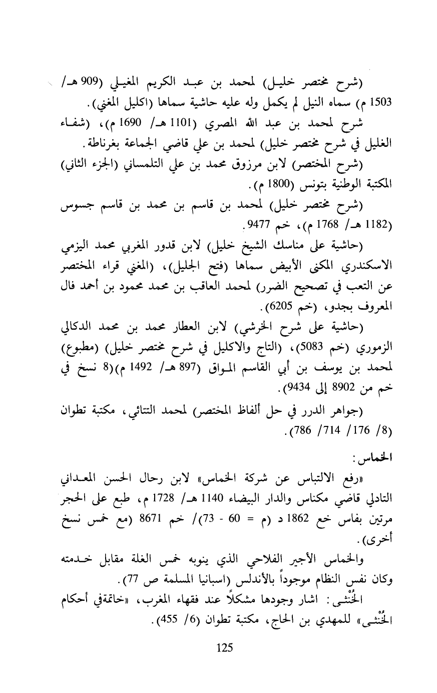 (حاشية على شرح الخرشي) لابن العطار محمد بن محمد الدكالي الزموري (خم 5083) , (التاج والاكليل في شرح مختصر خليل) (مطبوع) لمحمد بن يوسف بن أبي القاسم المواق (897 هـ/ 1492 م) (8 نسخ في خم من 8902 إلى 9434).