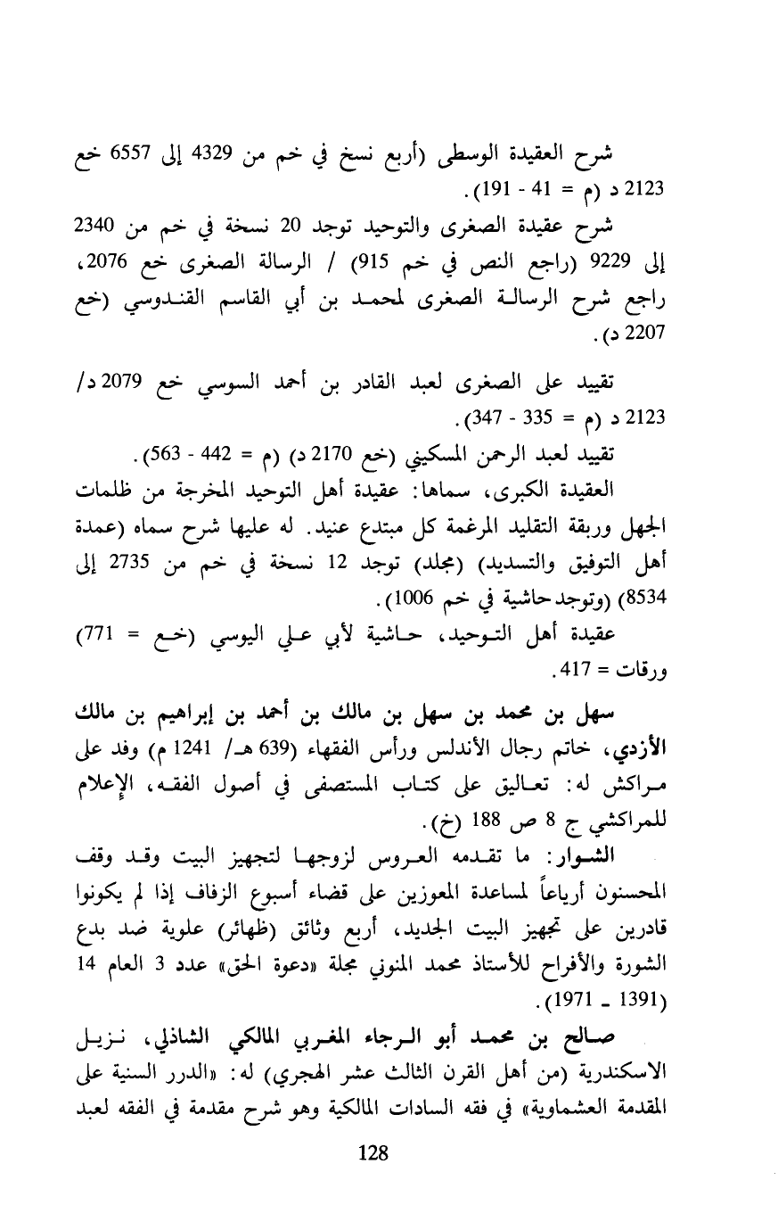 شرح عقيدة الصغرى والتوحيد توجد 20 نسخة في خم من 2340 إلى 9229 (راجع النص في خم 915) / الرسالة الصغرى خع 2076، راجع شرح الرسالة الصغرى لمحمد بن أبي القاسم القندوسي (خع 2207 د).