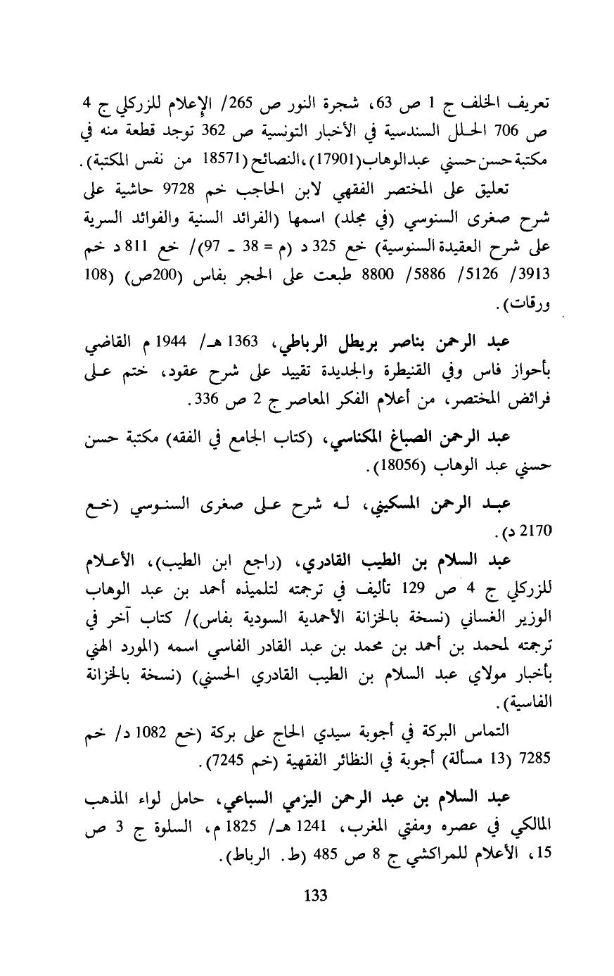 تعليق على المختصر الفقهي لابن الحاجب خم 9728 حاشية على شرح صغرى السنوسي (في مجلد) اسمها (الفرائد السنية والفوائد السرية على شرح العقيدة السنوسية) خع 325 د (م = 38 - 97) / خع 811 د خم 3913/ 5126/ 5886/ 8800 طبعت على الحجر بفاس (200 ص) (108 ورقات).