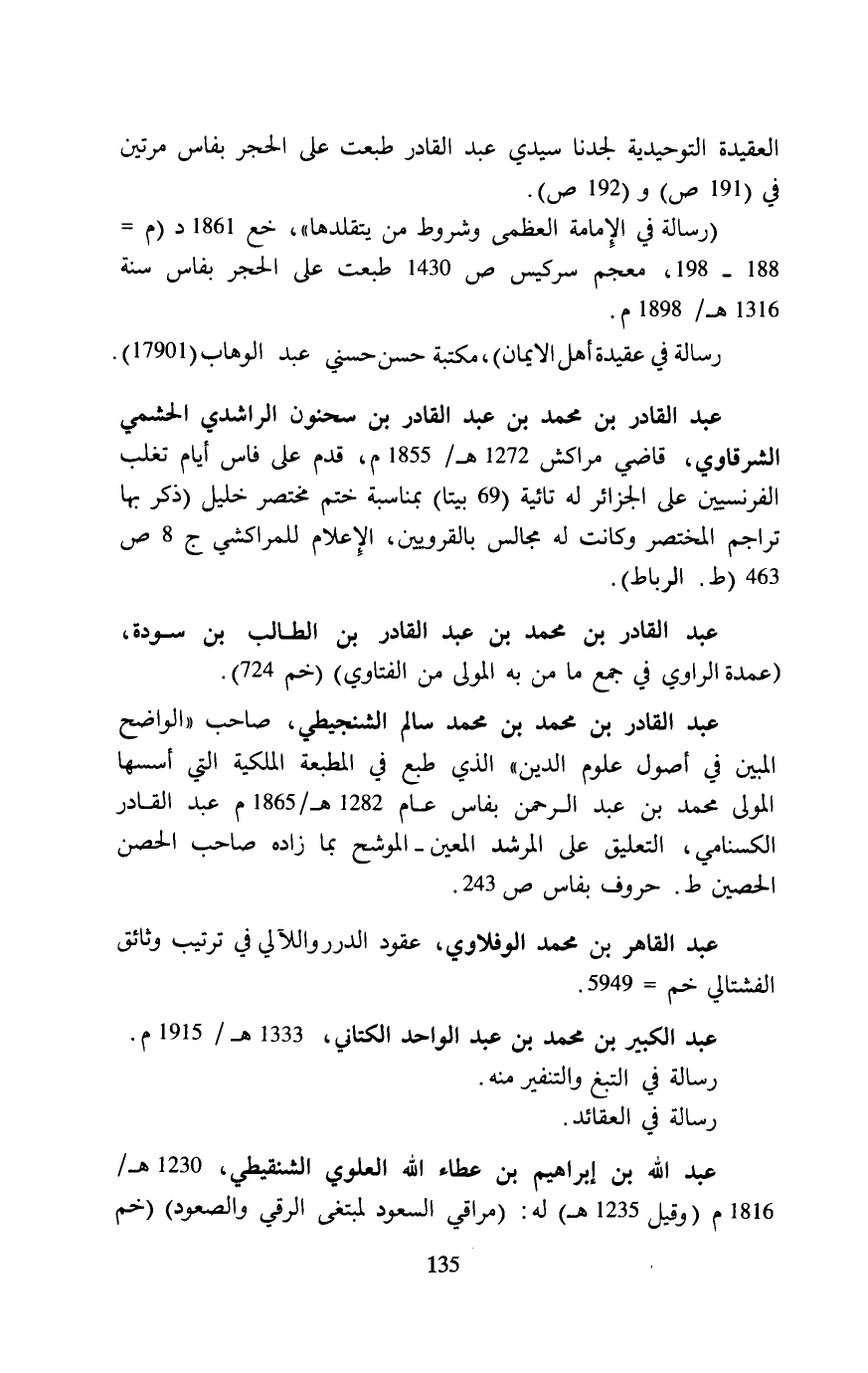 العقيدة التوحيدية لجدنا سيدي عبد القادر طبعت على الحجر بفاس مرتين في (191 ص) و (192 ص).