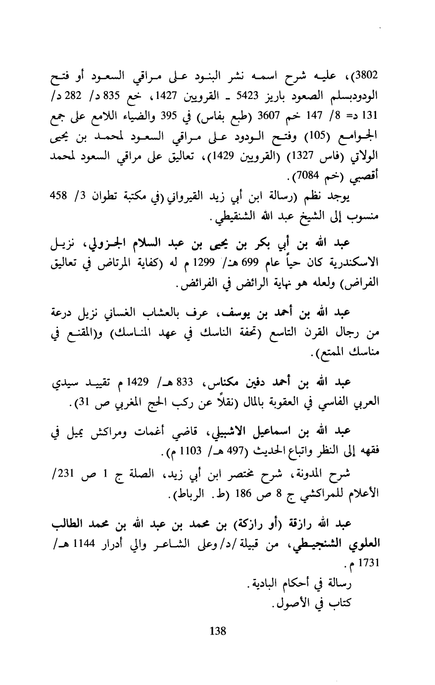 3802)، عليه شرح اسمه نشر البنود على مراقي السعود أو فتح الودود بسلم الصعود باريز 5423 - القروين 1427، خع 835 د/282 د/ 131 د = 8/ 147 خم 3607 (طبع بفاس) في 395 والضياء اللامع على جمع الجوامع (105) وفتح الودود على مراقي السعود لمحمد بن يحيي الولاتي (فاس 1327) (القروين 1429)، تعاليق على مراقي السعود لمحمد