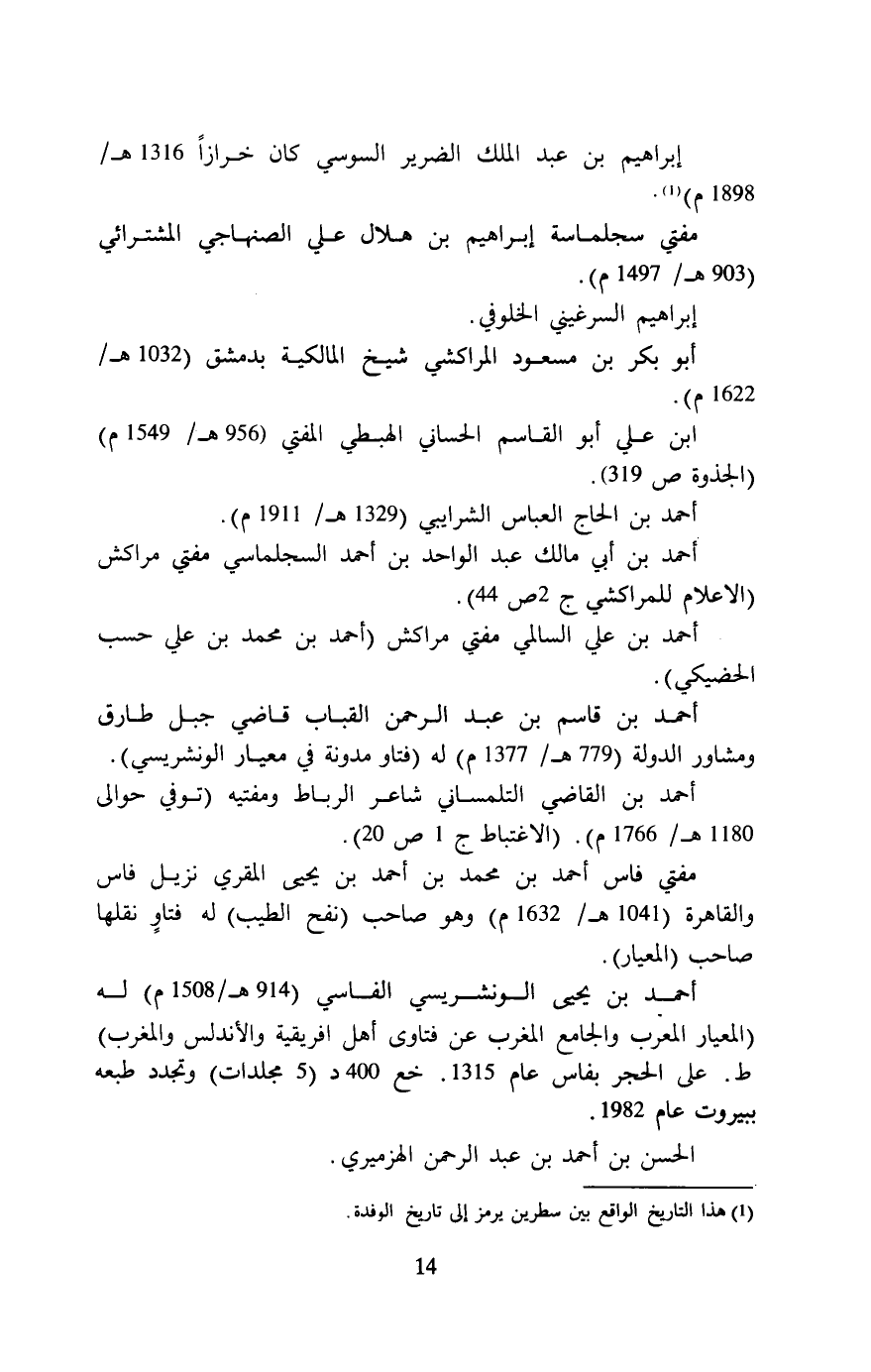 أحمد بن يحى الونشريسي الفاسي (914 هـ / 1508 م) (المعيار المعرب والجامع المغرب عن فتاوى أهل افريقية والأندلس والمغرب) ط. على الحجر بفاس عام 1315. خع 400 د (5 مجلدات) وتجدد طبعه ببيروت عا 1982.