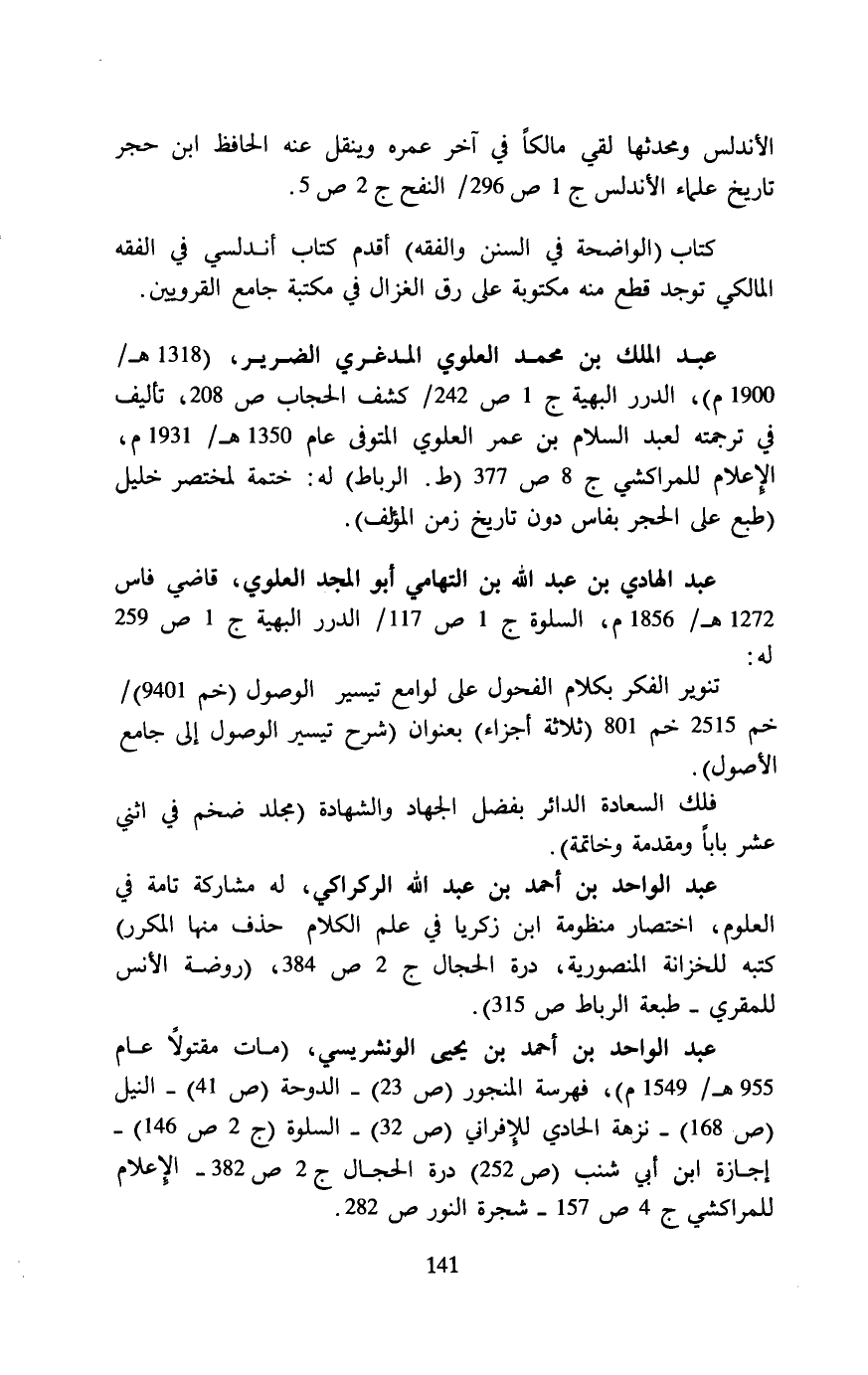 عبد الملك بن محمد العلوي المدغري الضرير، (1318 هـ/ 1900 م)، الدرر البهية ج 1 ص 242/ كشف الحجاب ص 208، تأليف في ترجمته لعبد السلام بن عمر العلوي المتوفى عام 1350 هـ/1931 م، الإِعلام للمراكشي ج 8 ص 377 (ط. الرباط) له: ختمة لمختصر خليل (طبع على الحجر بفاس دون تاريخ زمن المؤلف).