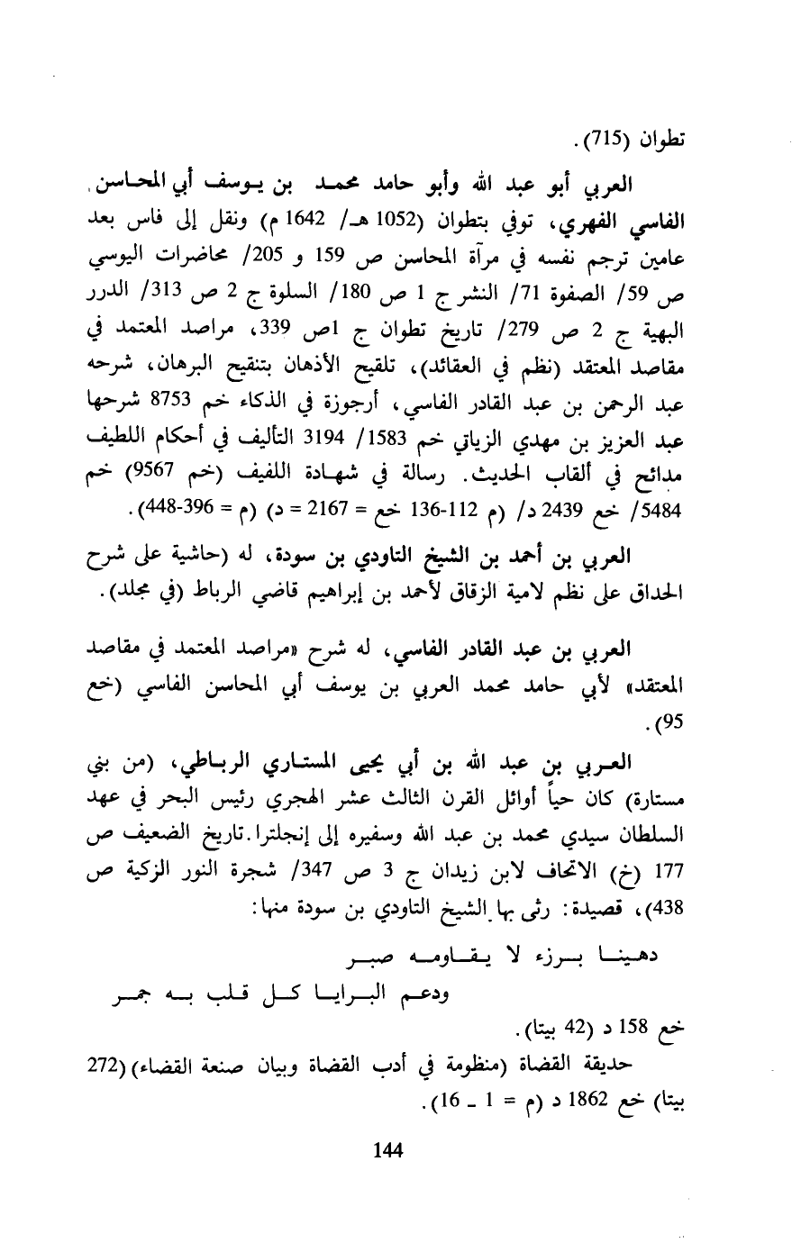 العربي أبو عبد الله وأبو حامد محمد بن يوسف أبي المحاسن الفاسي الفهري، توفي بتطوان (1052 هـ/ 1642 م) ونقل إلى فاس بعد عامين ترجم نفسه في مرآة المحاسن ص 159 و 205/ محاضرات اليوسي ص 59/الصفوة 71/ النشر ج 1 ص 180/ السلوة ج 2 ص 313/ الدرر البهية ج 2 ص 279/ تاريخ تطوان ج 1 ص 339، مراصد المعتمد في مقاصد المعتقد (نظم في العقائد)، تلقيح الأذهان بتنقيح البرهان، شرحه عبد الرحمن بن عبد القادر الفاسي، أرجوزة في الذكاء خم 8753 شرحها عبد العزيز بن مهدي الزياتي خم 1583/ 3194 التأليف في أحكام اللطيف مدائح في ألقاب الحديث. رسالة في شهادة اللفيف (خم 9567) خم 5484/خع 2439 د/ (م 112 - 136 خع = 2167 = د). (م = 396 - 448).