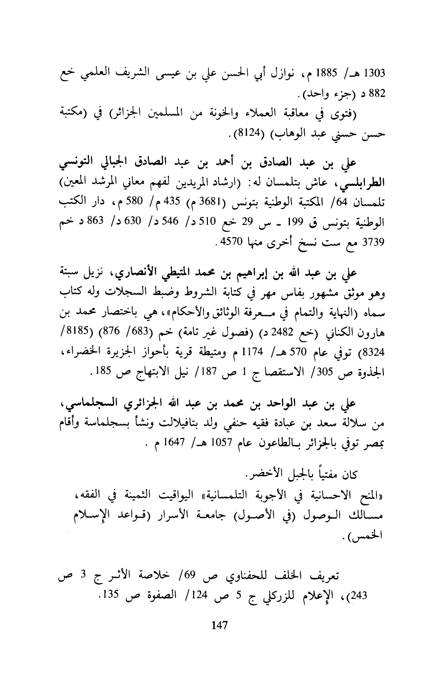 1303 هـ/1885 م، نوازل أبي الحسن علي بن عيسى الشريف العلمي خع 882 د (جزء واحد).