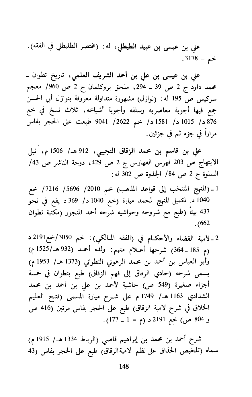 علي بن قاسم بن محمد الزقاق التجيبي، 912 هـ/ 1506 م، نيل الابتهاج ص 203 فهرس الفهارس ج 2 ص 429، دوحة الناشر ص 43 / السلوة ج 2 ص 84 / الجذوة ص 302 له: