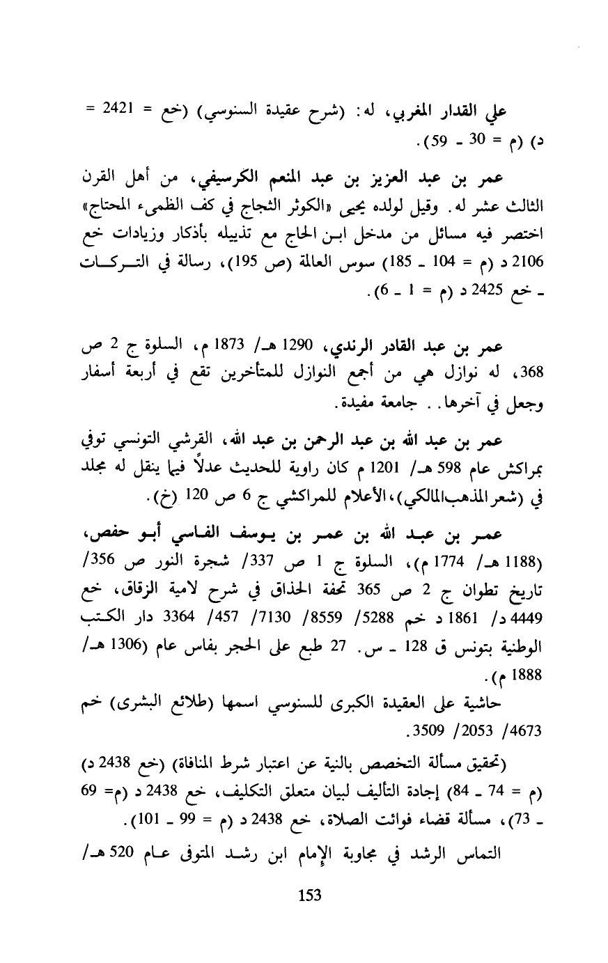 علي القدار المغربي، له: (شرح عقيدة السنوسي) (خع = 2421 = د) (م = 30 - 59).