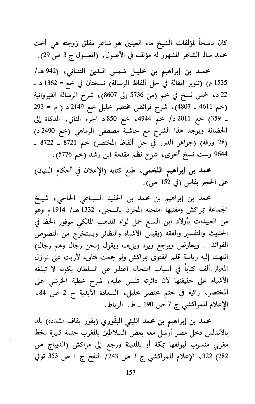 محمد بن إبراهيم بن خليل شمس الدين التتائي، (942 هـ/ 1535 م) (تنوير المقالة في حل ألفاظ الرسالة) نسختان في خع = 1362 د - 22 د، خمس نسخ في خم (من 5736 إلى 8607)، شرح الرسالة القيروانية (خم 4611 - 4807)، شرح فرائض مختصر خليل خع 2149 د (م = 293 - 359) - خع 2011 د/ خم 4944 خع 850. الجزء الثاني، الذكاة إلى الحضانة ويوجد هذا الشرح مع حاشية مصطفى الرماهي (خع 2490 د) (28 ورقة) (جواهر الدرر في حل ألفاظ المختصر) خم 8721 - 8722 - 9644 وست نسخ أخرى، شرح نظم مقدمة ابن رشد (خم 5776).