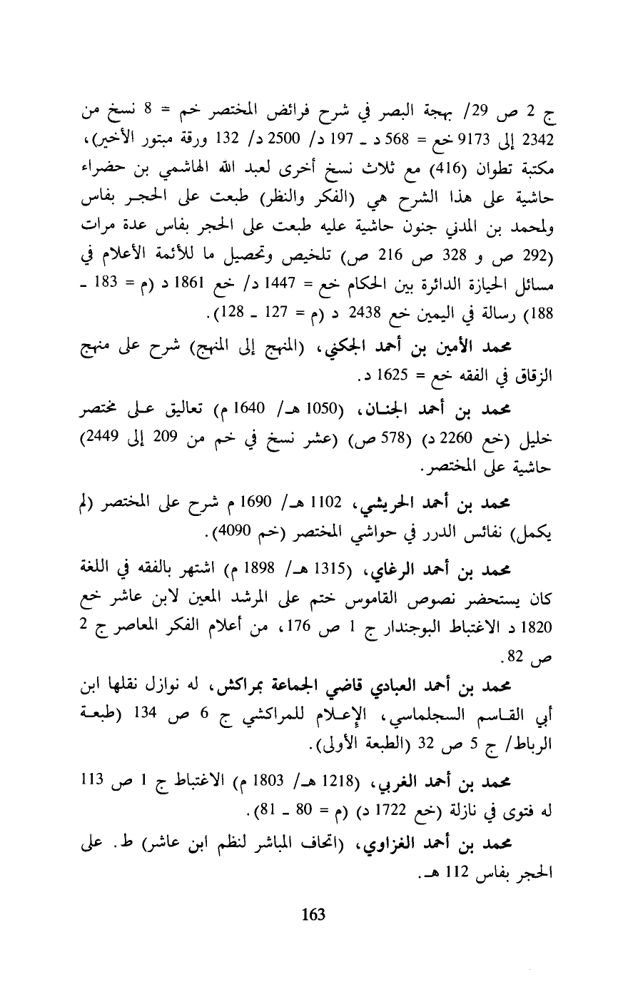 محمد بن أحمد الجنان، (1050 هـ/1640 م) تعاليق على مختصر خليل (خع 2260 د) (578 ص) (عشر نسخ في خم من 209 إلى 2449) حاشية على المختصر.