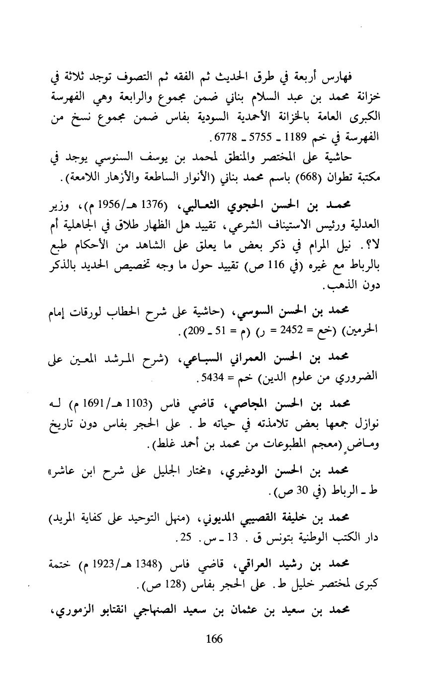 محمد بن الحسن الحجوي الثعالبي، (1376 هـ/1956 م)، وزير العدلية ورئيس الاستيناف الشرعي، تقييد هل الظهار طلاق في الجاهلية أم لا؟ . نيل المرام في ذكر بعض ما يعلق على الشاهد من الأحكام طبع بالرباط مع غيره (في 116 ص) تقييد حول ما وجه تخصيص الحديد بالذكر دون الذهب.