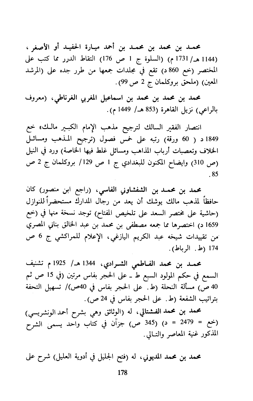 محمد بن محمد الفشتالي، له (الوثائق وهي بشرح أحمد الونشريسي) (خع = 2479 = د) (345 ص) جزآن في كتاب واحد يسمى الشرح المذكور غنية المعاصر والتالي.
