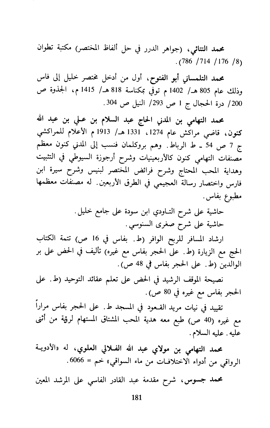 ارشاد المسافر للربح الوافر (ط. بفاس في 16 ص) تتمة الكتاب الحج مع الزيارة (ط. على الحجر بفاس مع غيره) تأليف في الحض على بر الوالدين (ط. على الحجر بفاس في 48 ص).