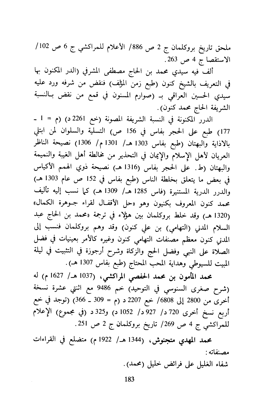 محمد المأون بن محمد الحفصي المراكشي، (1037 هـ/1627 م) له (شرح صغرى السنوسي في التوحيد) خم 9486 مع اثنتي عشرة نسخة أخرى من 2800 إلى 6808/ خم 2207 د (م = 309 - 366) (توجد في خع أربع نسخ أخرى 720 د/ 927 د/ 1052 د) ,325 د (في مجموع) الإِعلام للمراكشي ج 4 ص 269/ تاريخ بروكلمان ج 2 ص 251.