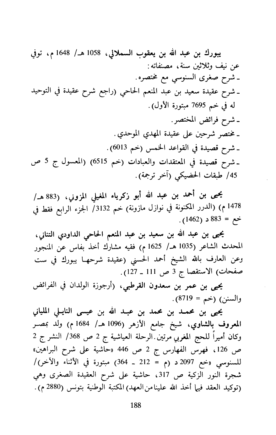 يبورك بن عبد الله بن يعقوب السملالي، 1058 هـ/ 1648 م، توفي عن نيف وثلاثين سنة، مصنفاته: