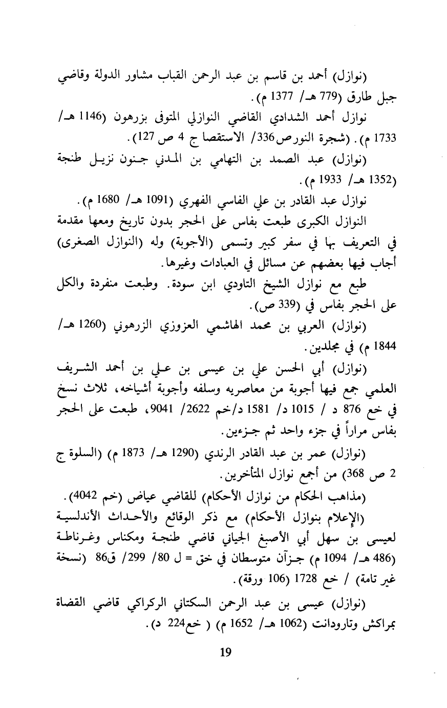 نوازل أحمد الشدادي القاضي النوازلي المتوفى بزرهون (1146 هـ / 1733 م). (شجرة النور ص 336 / الاستقصا ج 4 ص 127).