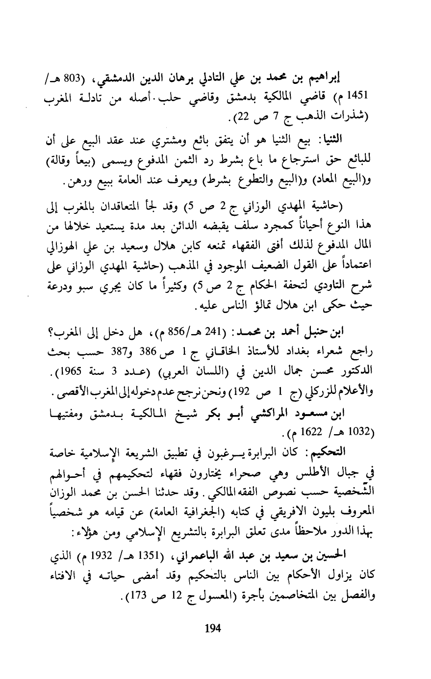 التحكيم: كان البرابرة يرغبون في تطبيق الشريعة الِإسلامية خاصة في جبال الأطلس وهي صحراء يختارون فقهاء لتحكيمهم في أحوالهم الشَخصية حسب نصوص الفقه المالكي. وقد حدثنا الحسن بن محمد الوزان المعروف بليون الافريقي في كتابه (الجغرافية العامة) عن قيامه هو شخصياً بهذا الدور ملاحظاً مدى تعلق البرابرة بالتشريع الِإسلامي ومن هؤلاء: