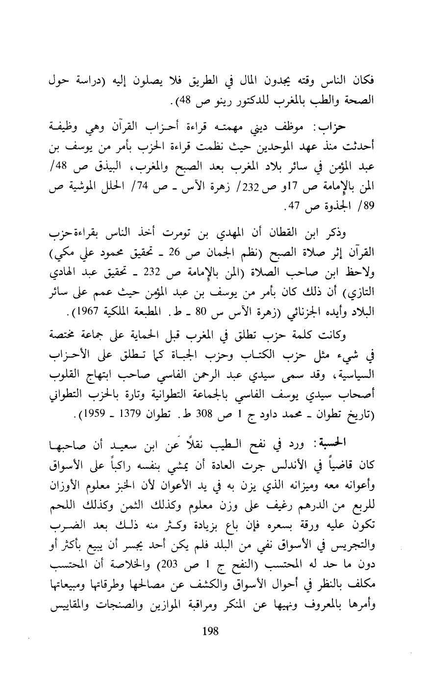 الحسبة: ورد في نفح الطيب نقلاً عَن ابن سعيد أن صاحبها كان قاضياً في الأندلس جرت العادة أن يمشي بنفسه راكباً على الأسواق وأعوانه معه وميزانه الذي يزن به في يد الأعوان لأن الخبز معلوم الأوزان للربع من الدرهم رغيف على وزن معلوم وكذلك الثمن وكذلك اللحم تكون عليه ورقة بسعره فإن باع بزيادة وكثر منه ذلك بعد الضرب والتجريس في الأسواق نفي من البلد فلم يكن أحد يجسر أن يبيع بأكثر أو دون ما حد له المحتسب (النفح ج 1 ص 203) والخلاصة أن المحتسب