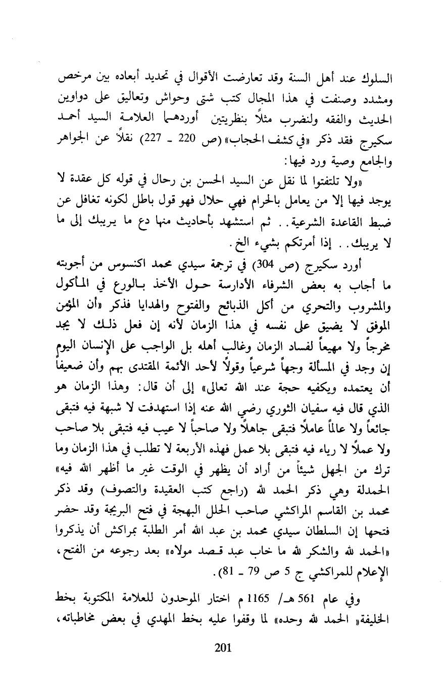 أورد سكيرج (ص 304) في ترجمة سيدي محمَّد اكنسوس من أجوبته ما أجاب به بعض الشرفاء الأدارسة حول الأخذ بالورع في المأكول والمشروب والتحري من أكل الذبائح والفتوح والهدايا فذكر "أن المؤمن الموفق لا يضيق على نفسه في هذا الزمان لأنه إن فعل ذلك لا يجد مخرجًا ولا مهيعًا لفساد الزمان وغالب أهله بل الواجب على الإنسان اليوم إن وجد في المسألة وجهًا شرعيًا وقولًا لأحد الأئمة المقتدى بهم وأن ضعيفًا أن يعتمده ويكفيه حجة عند الله تعالى" إلى أن قال: وهذا الزمان هو الذي قال فيه سفيان الثوري رضي الله عنه إذا استهدفت لا شبهة فيه فتبقى جائعًا ولا عالمًا عاملًا فتبقى جاهلًا ولا صاحباً لا عيب فيه فتبقى بلا صاحب ولا عملًا لا رياء فيه فتبقى بلا عمل فهذه الأربعة لا تطلب في هذا الزمان وما ترك من الجهل شيئًا من أراد أن يظهر في الوقت غير ما أظهر الله فيه" الحمدلة وهي ذكر الحمد لله (راجع كتب العقيدة والتصوف) وقد ذكر محمَّد بن القاسم المراكشي صاحب الحلل البهجة في فتح البريجة وقد حضر فتحها إن السلطان سيدي محمَّد بن عبد الله أمر الطلبة بمراكش أن يذكروا "الحمد لله والشكر لله ما خاب عبد قصد مولاه" بعد رجوعه من الفتح، الإِعلام للمراكشي ج 5 ص 79_ 81).