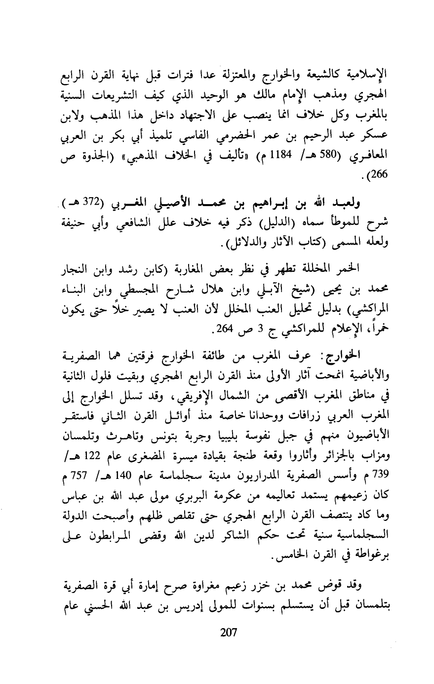 الِإسلامية كالشيعة والخوارج والمعتزلة عدا فترات قبل نهاية القرن الرابع الهجري ومذهب الإِمام مالك هو الوحيد الذي كيف التشريعات السنية بالمغرب وكل خلاف إنما ينصب على الاجتهاد داخل هذا المذهب ولابن عسكر عبد الرحيم بن عمر الحضرمي الفاسي تلميذ أبي بكر بن العربي المعافري (580 هـ / 1184 م) "تأليف في الخلاف المذهبي" (الجذوة ص 266)