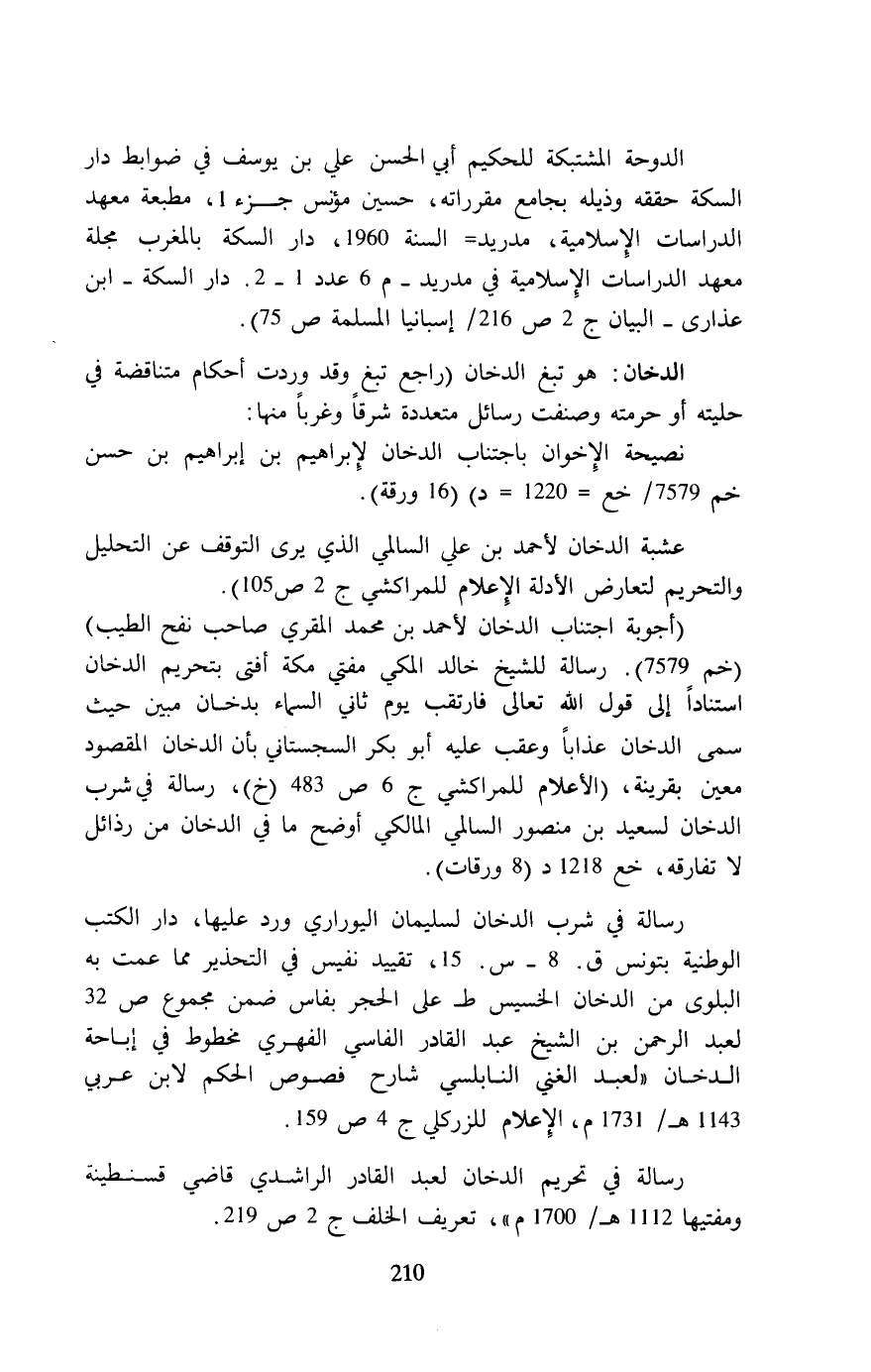 (أجوبة اجتناب الدخان لأحمد بن محمَّد المقري صاحب نفح الطيب) (خم 7579). رسالة للشيخ خالد المكي مفتي مكة أفتى بتحريم الدخان استناداً إلى قول الله تعالى فارتقب يوم تأتي السماء بدخان مبين حيث سمى الدخان عذابا وعقب عليه أبو بكر السجستاني بأن الدخان المقصود معين بقرينة، (الأعلام للمراكشي ج 6 ص 483 (خ)، رسالة في شرب الدخان لسعيد بن منصور السالمي المالكي أوضح ما في الدخان من رذائل لا تفارقه، خع 1218 د (8 ورقات).