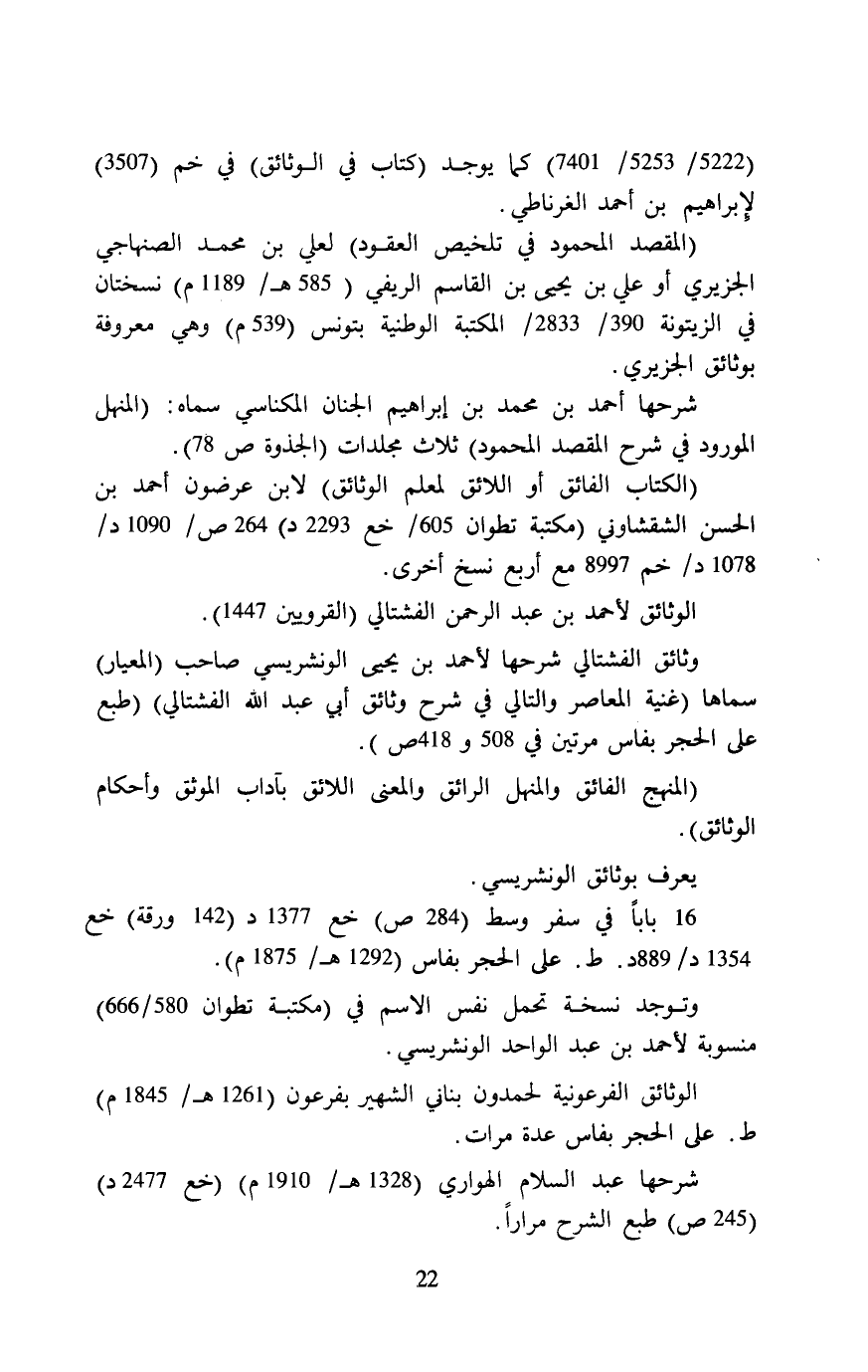(الكتاب الفائق أو اللائق لمعلم الوثائق) لابن عرضون أحمد بن الحسن الشقشاوني (مكتبة تطوان 605/ خع 2293 د). 264 ص 1090 د/ 1078 د/ خم 8997 مع أربع نسخ أخرى.