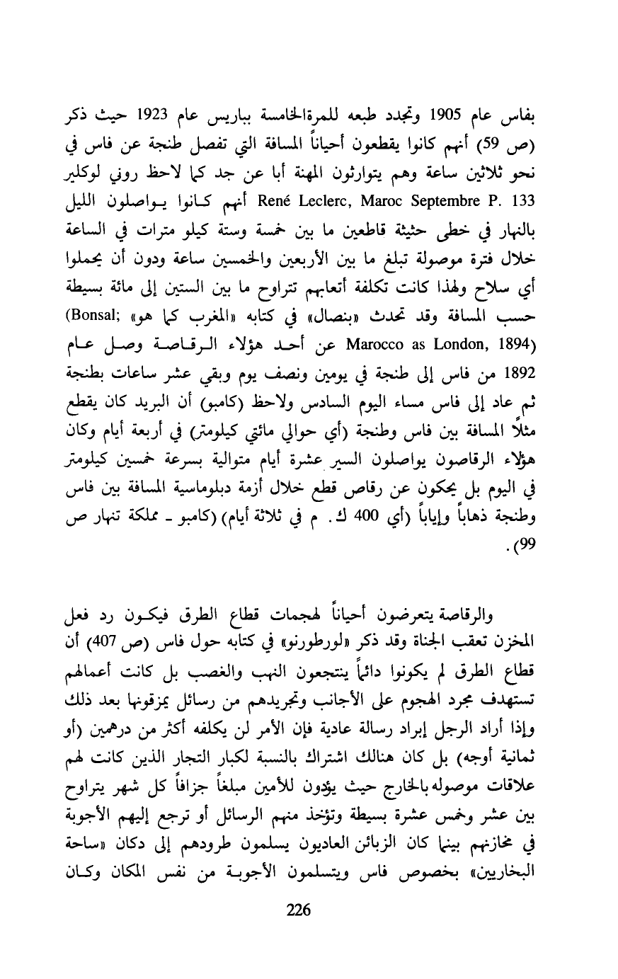 بفاس عام 1905 وتجدد طبعه للمرِة الخامسة بباريس عام 1923 حيث ذكر (ص 59) أنهم كانوا يقطعون أحياناً المسافة التي تفصل طنجة عن فاس في نحو ثلاثين ساعة وهم يتوارثون المهنة أبا عن جد كما لاحظ روني لوكلير 133. Rene Leclerc, Maroc Septembre P أنهم كانوا يواصلون الليل بالنهار في خطى حثيثة قاطعين ما بين خمسة وستة كيلو مترات في الساعة خلال فترة موصولة تبلغ ما بين الأربعين والخمسين ساعة ودون أن يحملوا أي سلاح ولهذا كانت تكلفة أتعابهم تتراوح ما بين الستين إلى مائة بسيطة حسب المسافة وقد تحدث "بنصال" في كتابه "المغرب كما هو" Bonsai,) (1894 ,Marocco as London عن أحد هؤلاء الرقاصة وصل عام 1892 من فاس إلى طنجة في يومين ونصف يوم وبقي عشر ساعات بطنجة ثم عاد إلى فاس مساء اليوم السادس ولاحظ (كامبو) أن البريد كان يقطع