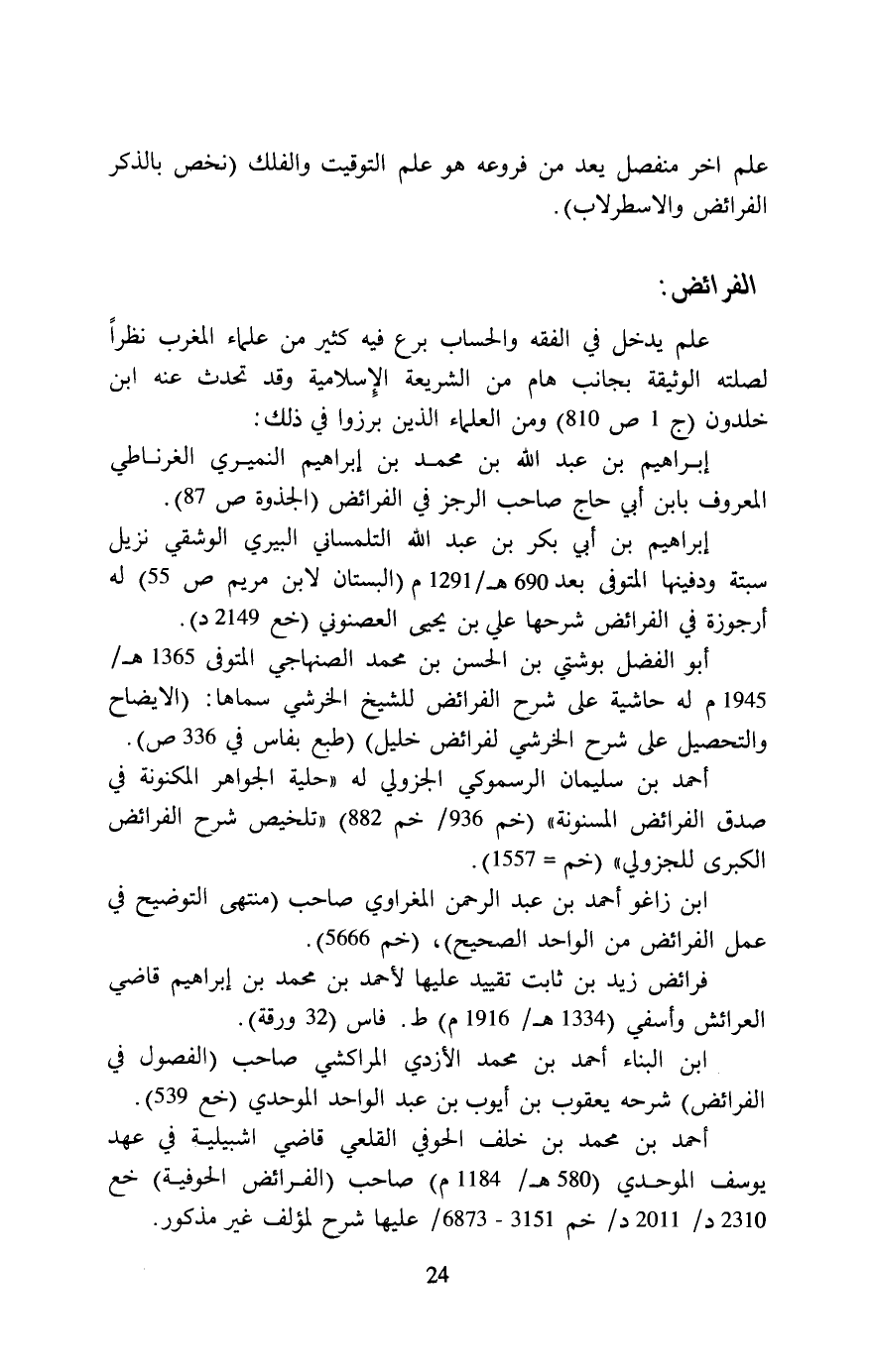 علم يدخل في الفقه والحساب برع فيه كثير من علماء المغرب نظراً لصلته الوثيقة بجانب هام من الشريعة الِإسلامية وقد تحدث عنه ابن خلدون (ج 1 ص 810) ومن العلماء الذين برزوا في ذلك: