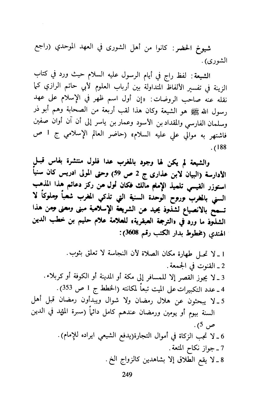 والشيعة لم يكن لها وجود بالمغرب عدا فلول منتشرة بفاس قبلٍ الأدارسة (البيان لابن عذارى ج 2 ص 59) وحتى المولى ادريس كان سنيا استوزر القيسي تلميذ الإمام مالك فكان أول من ركز دعائم هذا المذهب السنى بالمغرب وروح الوحدة السنية التي تذكي المغرب شعبًا وملوكاً لا تسمح بالانصياع لشذوذ يحيد عن الشريعة الإسلامية مبني ومعنى ومن هذا الشذوذ ما ورد في "الترجمة العبقرية" للعلامة علام حليم بن خطب الدين الهندي (مخطوط بدار الكتب رقم 3608):