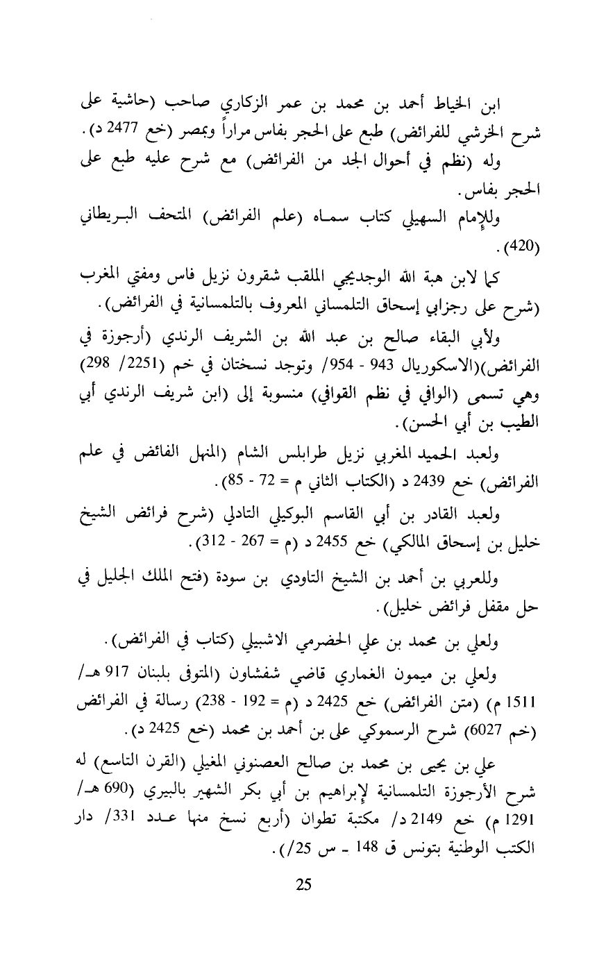 ولعبد القادر بن أبي القاسم البوكيلي التادلي (شرح فرائض الشَّيخ خليل بن إسحاق المالكي) خع 2455 د (م = 267 - 312).