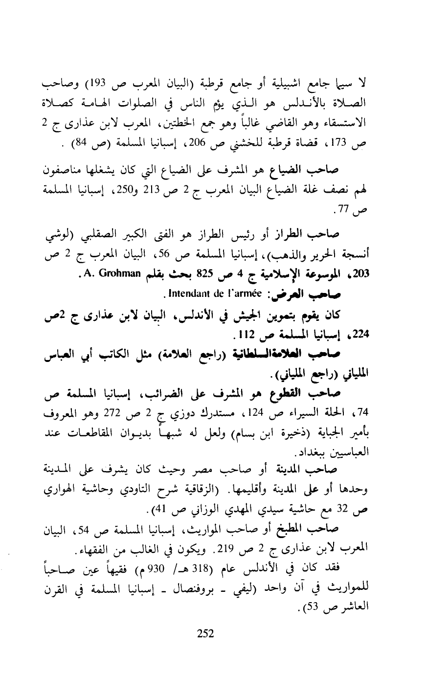 لا سيما جامع اشبيلية أو جامع قرطبة (البيان المعرب ص 193) وصاحب الصلاة بالأندلس هو الذي يؤم الناس في الصلوات الهامة كصلاة الاستسقاء وهو القاضي غالبًا وهو جمع الخطتين، المعرب لابن عذارى ج 2 ص 173، قضاة قرطبة للخشني ص 206، إسبانيا المسلمة (ص 84).