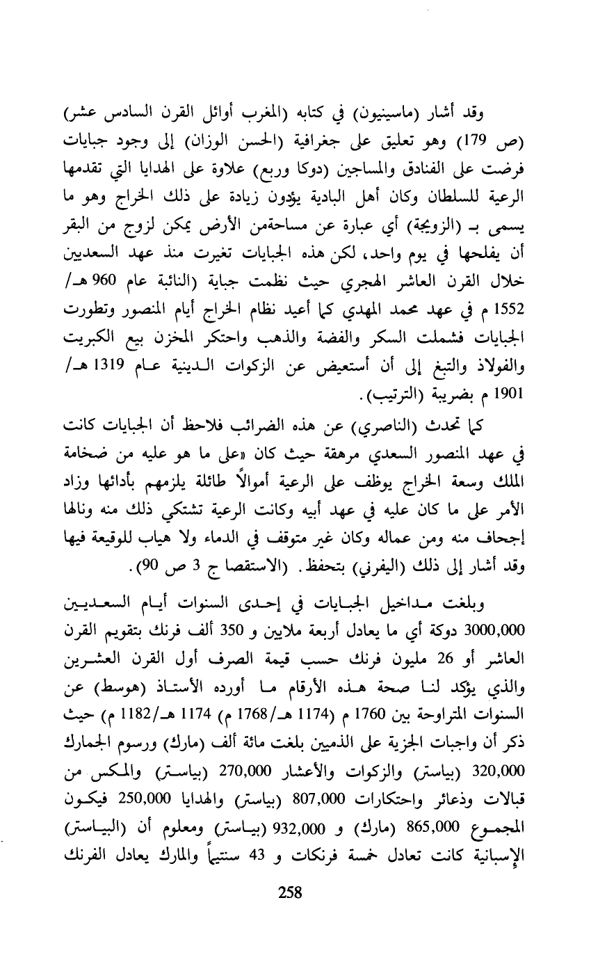 1552 م في عهد محمد المهدي كما أعيد نظام الخراج أيام المنصور وتطورت الجبايات فشملت السكر والفضة والذهب واحتكر المخزن بيع الكبريت والفولاذ والتبغ إلى أن أستعيض عن الزكوات الدينية عام 1319 هـ/ 1901 م بضريبة (الترتيب).