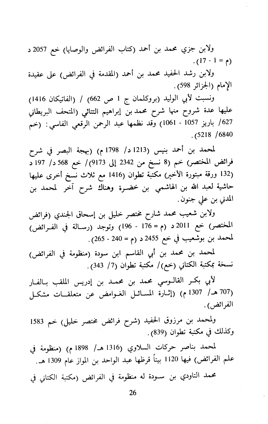 ولمحمد بن مرزوق الحفيد (شرح فرائض مختصر خليل) خم 1583 وكذلك في مكتبة تطوان (839).