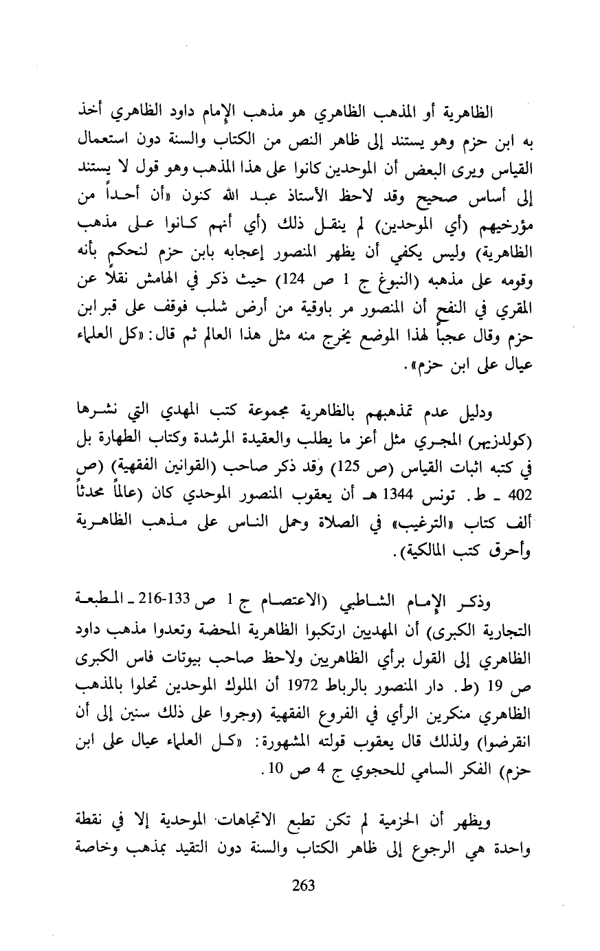 وذكر الإمام الشاطبي (الاعتصام ج 1 ص 133 - 216 - المطبعة التجارية الكبرى) أن المهديين ارتكبوا الظاهرية المحضة وتعدوا مذهب داود الظاهري إلى القول برأي الظاهريين ولاحظ صاحب بيوتات فاس الكبرى ص 19 (ط. دار المنصور بالرباط 1972 أن الملوك الموحدين تحلوا بالمذهب الظاهري منكرين الرأي في الفروع الفقهية (وجروا على ذلك سنين إلى أن انقرضوا) ولذلك قال يعقوب قولته المشهورة: "كل العلماء عيال على ابن حزم) الفكر السامي للحجوي ج 4 ص 10.