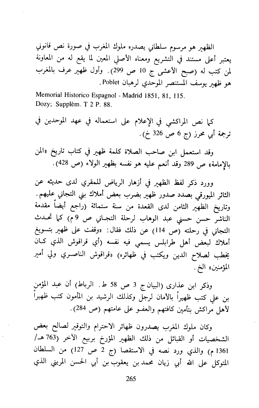 وذكر ابن عذارى (البيان ج 3 ص 58 ط. الرباط) أن عبد المؤمن بن علي كتب ظهيرًا بالأمان لرجل وكذلك الرشيد بن المأمون كتب ظهيراً لأهل مراكش بتأمين كافتهم والعفو على عامتهم (ص 284).