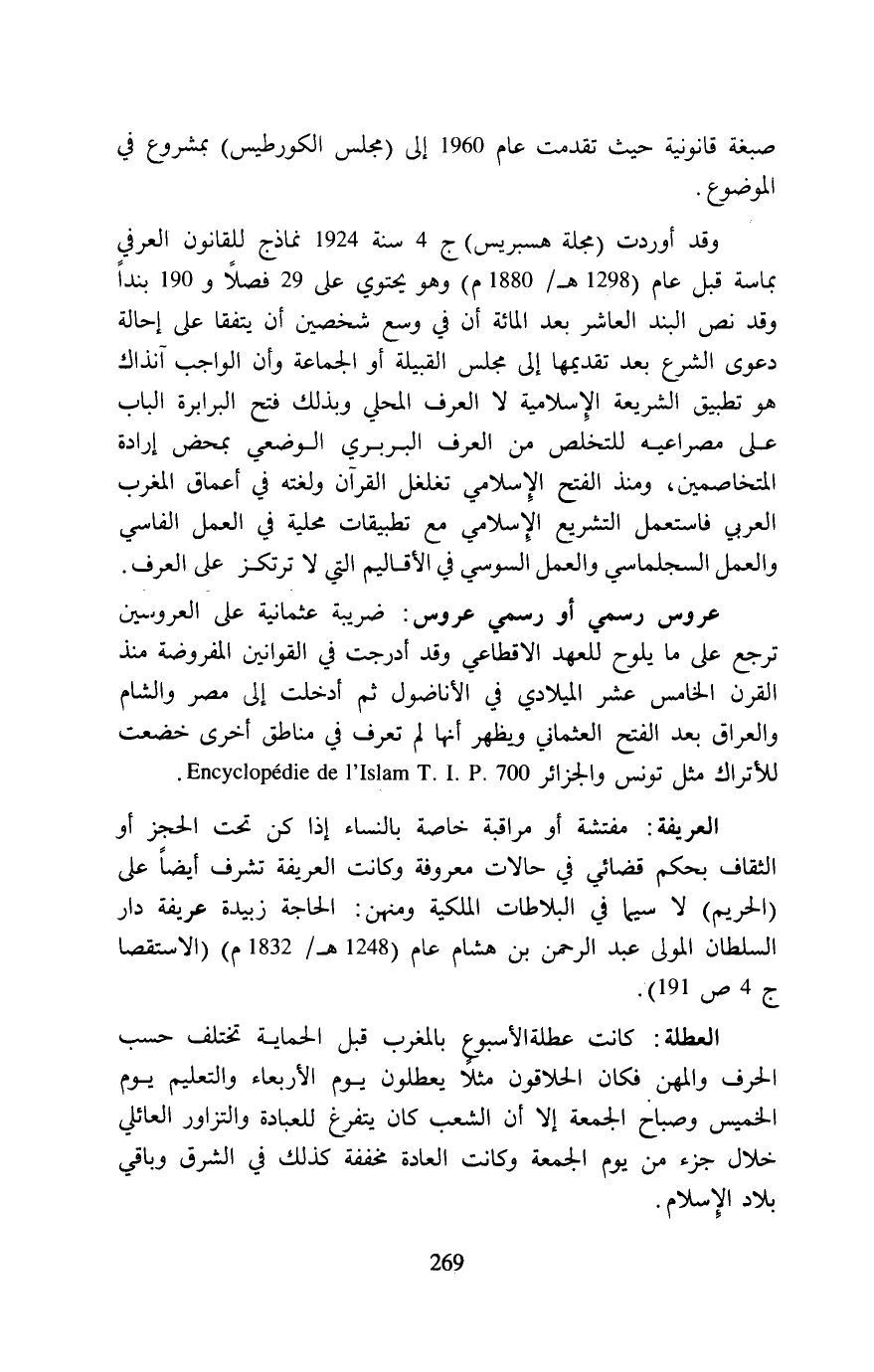 وقد أوردت (مجلة هسبريس) ج 4 سنة 1924 نماذج للقانون العرفي بماسة قبل عام (1298 هـ/ 1880 م) وهو يحتوي على 29 فصلاً و 190 بندًا وقد نص البند العاشر بعد المائة أن في وسع شخصين أن يتفقا على إحالة دعوى الشرع بعد تقديمها إلى مجلس القبيلة أو الجماعة وأن الواجب آنذاك هو تطبيق الشريعة الإِسلامية لا العرف المحلي وبذلك فتح البرابرة الباب على مصراعيه للتخلص من العرف البربري الوضعي بمحض إرادة المتخاصمين، ومنذ الفتح الإِسلامي تغلغل القرآن ولغته في أعماق المغرب العربي فاستعمل التشريع الِإسلامي مع تطبيقات محلية في العمل الفاسي والعمل السجلماسي والعمل السوسي في الأقاليم التي لا ترتكز على العرف.