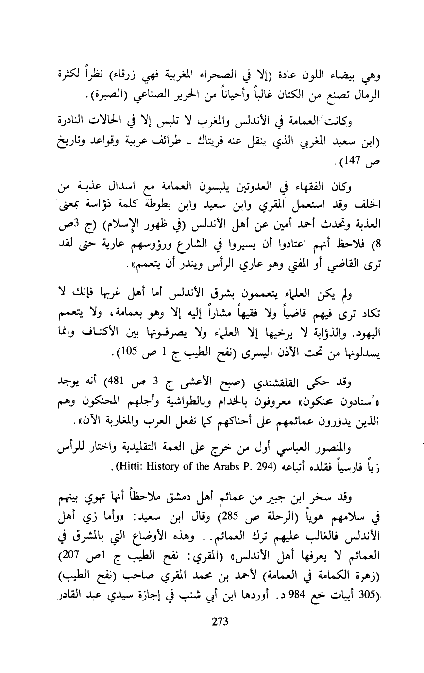 وقد سخر ابن جبير من عمائم أهل دمشق ملاحظاً أنها تهوي بينهم في سلامهم هوياً (الرحلة ص 285) وقال ابن سعيد: "وأما زي أهل الأندلس فالغالب عليهم ترك العمائم .. وهذه الأوضاع التي بالمشرق في العمائم لا يعرفها أهل الأندلس" (المقري: نفح الطيب ج 1 ص 207) (زهرة الكمامة في العمامة) لأحمد بن محمَد المقري صاحب (نفح الطيب) (305 أبيات خع 984 د. أوردها ابن أبي شنب في إجازة سيدي عبد القادر
