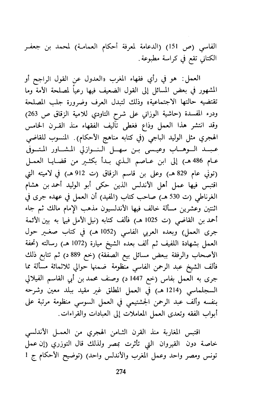 اقتبس فيها عمل أهل الأندلس الذين حكى أبو الوليد أحمد بن هشام الغرناطي (ت 530 هـ) صاحب كتاب (المفيد) أن العمل في عهده جرى في اثنتين وعشرين مسألة خالف فيها الأندلسيون مذهب الِإمام مالك ثم جاء أحمد بن القاضي (ت 1025 هـ) فألف كتابه (نيل الأمل فيما به بين الأئمة جرى العمل) وبعده العربي الفاسي) (1052 هـ) في كتاب صغير حول العمل بشهادة اللفيف ثم ألف بعده الشيخ ميارة (1072 هـ) رسالته (تحفة الأصحاب والرفقة ببعض مسائل بيع الصفقة) (خع 889 د) ثم تتابع ذلك فألف الشيخ عبد الرحمن الفاسي منظومة ضمنها حوالي ثلاثمائة مسألة مما جرى به العمل بفاس (خع 1447 د) وصنف محمد بن أبي القاسم الفيلالي السجلماسي (1214 هـ) في العمل المطلق غير مقيد ببلد معين وشرحه بنفسه وألف عبد الرحمن الجشتيمي في العمل السوسي منظومة مرتبة على أبواب الفقه وتعدى العمل المعاملات إلى العبادات والقراءات.